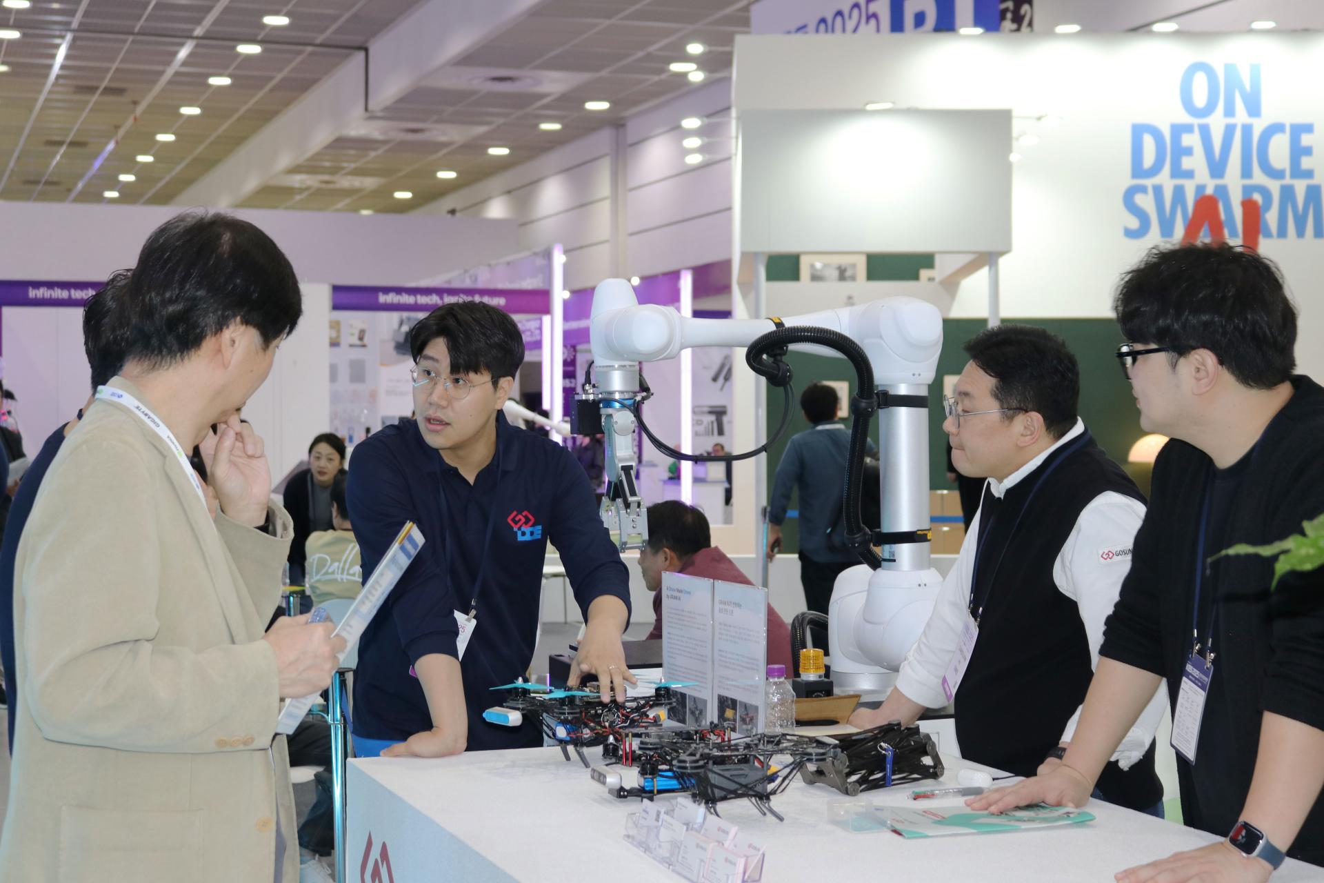 Under the theme “ON DEVICE SWARM AI,” DDE, in collaboration with Gosung Engineering, presented its cutting-edge offline AI system technology, where drones, MOMA (mobile manipulators), and SMART Chairs autonomously collaborate even in environments with limited internet or GPS/GNSS connectivity.